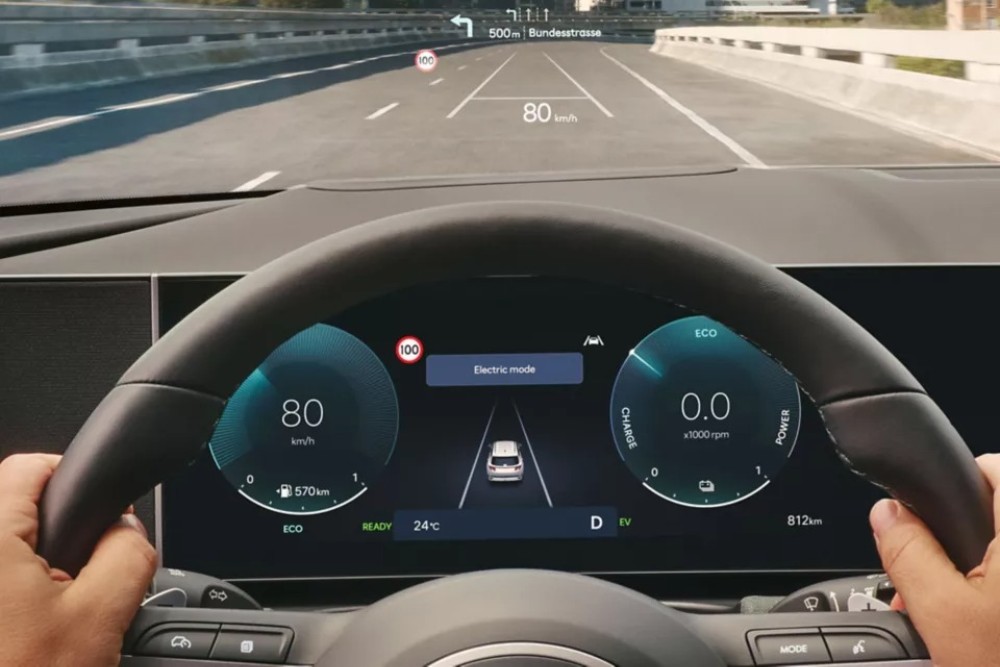 L'head-up display da 12” mette a tua disposizione, sulla visuale della corsia di fronte a te, informazioni essenziali per la guida, come la velocità e le indicazioni del navigatore.